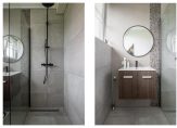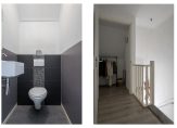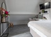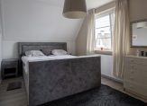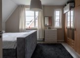 De badkamer is uitgevoerd in grijze kleurstelling en biedt een douchehoek, wastafelmeubel en vloerverwarming. De dakkapel zorgt voor natuurlijke ventilatie en daglicht. Daarnaast geschiedt ventilatie ook op mechanische wijze via de MV-unit.