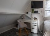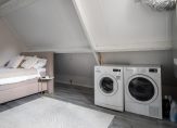 De verdieping boven de garage/bijkeuken is eenvoudig vanaf de tussenkamer te bereiken. Met een totale oppervlakte van circa 19 m² is deze ruimte MULTIFUNCTIONEEL…. kortom, perfect te gebruiken als een royale 4e slaapkamer, speelkamer voor de kinderen of een ruime werkplek. Thans vinden we hier de wasmachine en wasdroger aansluiting. Ook de warmtepomp staat hier opgesteld.