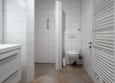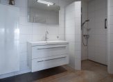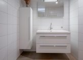 De badkamer is volledig betegeld in een lichte, moderne kleurstelling en beschikt over een inloopdouche, een wastafelmeubel, een hangend toilet en een designradiator. De ventilatie gebeurt zowel mechanisch als natuurlijk.