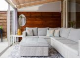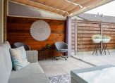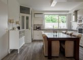 De lichte en ruime woonkamer heeft een oppervlakte van circa 26 m² en is voorzien van een onderhoudsvriendelijke PVC-vloer. Er is volop ruimte voor een comfortabele zithoek in combinatie met een royale eettafel. Vanuit de woonkamer is er directe toegang tot de serre/overkapping met glazen wanden, die op haar beurt toegang biedt tot de zonnige achtertuin.
