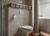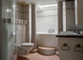De badkamer is compleet uitgerust met een dubbele wastafel, een designradiator, een hangend toilet, een ruime douche en een comfortabel ligbad. Ventilatie geschiedt op zowel mechanische als natuurlijke wijze.