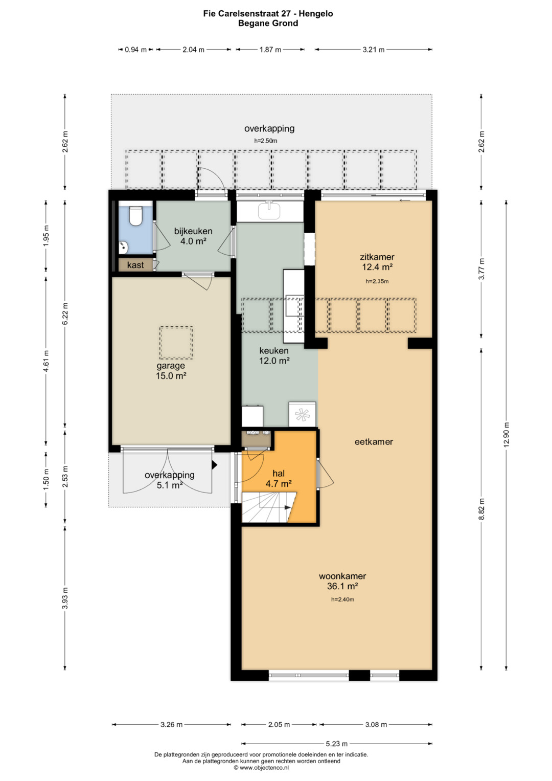 Entree/hal met meterkast en vaste trapopgang naar de eerste verdieping, woonkamer, keuken, zitkamer, bijkeuken met toilet en de garage.