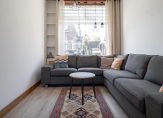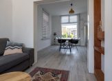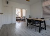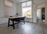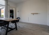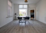 De woonkamer met eetkamer meet circa 26 m² en is voorzien van een laminaat vloer in lichte kleurstelling.
