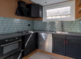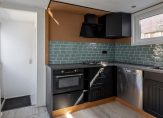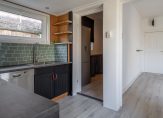 De half open keuken is voorzien van een aanrechtblad waarin verwerkt een enkele RVS spoelbak. De keuken is voorzien van de navolgende inbouwapparatuur: RVS- afzuigkap, 4-pits gaskookplaat, vaatwasser en combimagnetronoven.