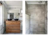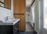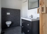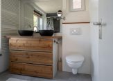 De moderne badkamer meet respectievelijk 6 m² en is uitgerust met een dubbele wastafel, inloopdouche en toilet. Ventilatie geschiedt op natuurlijke wijze.
