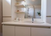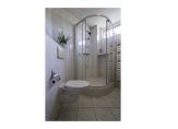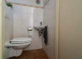 De badkamer is aan de voorzijde gelegen, uitgevoerd in een lichte kleurstelling en voorzien van een wastafelmeubel, designradiator en een douchecabine. De ruimte wordt op natuurlijke wijze geventileerd en heeft een frisse, verzorgde uitstraling.