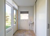 Achter de keuken ligt een praktische bijkeuken met plek voor de wasmachine en wasdroger, vaste kastruimte en een deur naar de achtertuin. Ideaal voor extra bergruimte en dagelijks gebruiksgemak.