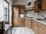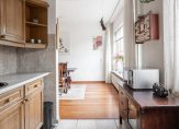 Aansluitend aan de woonkamer de keuken met een eiken inbouwkeuken, voorzien van kunststof werkblad met rvs spoelbak. Als inbouwapparatuur heeft u de beschikking over een 4-pits gastoestel, afzuigkap en een koelkast.