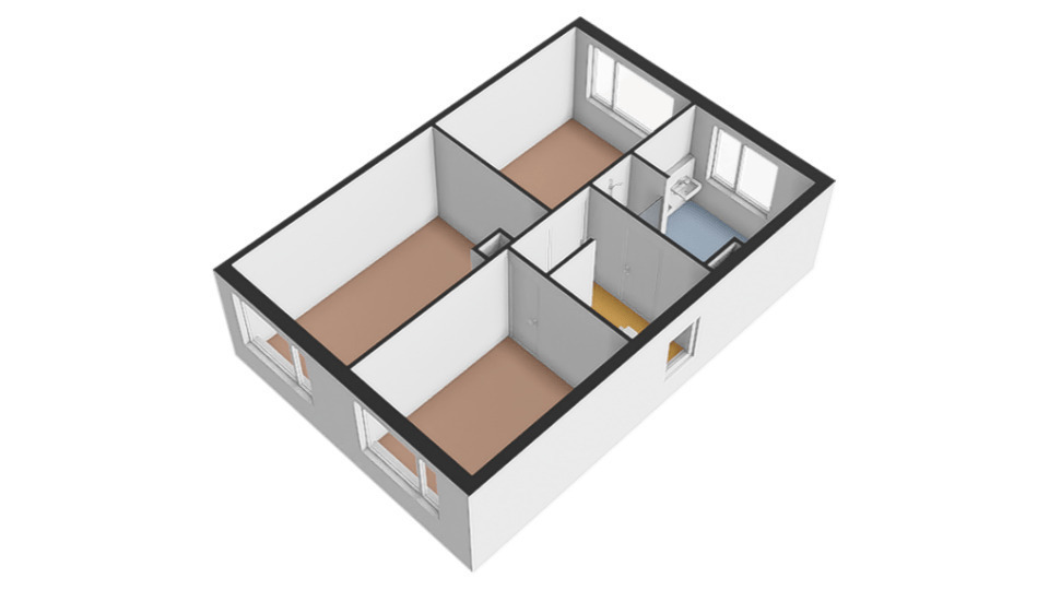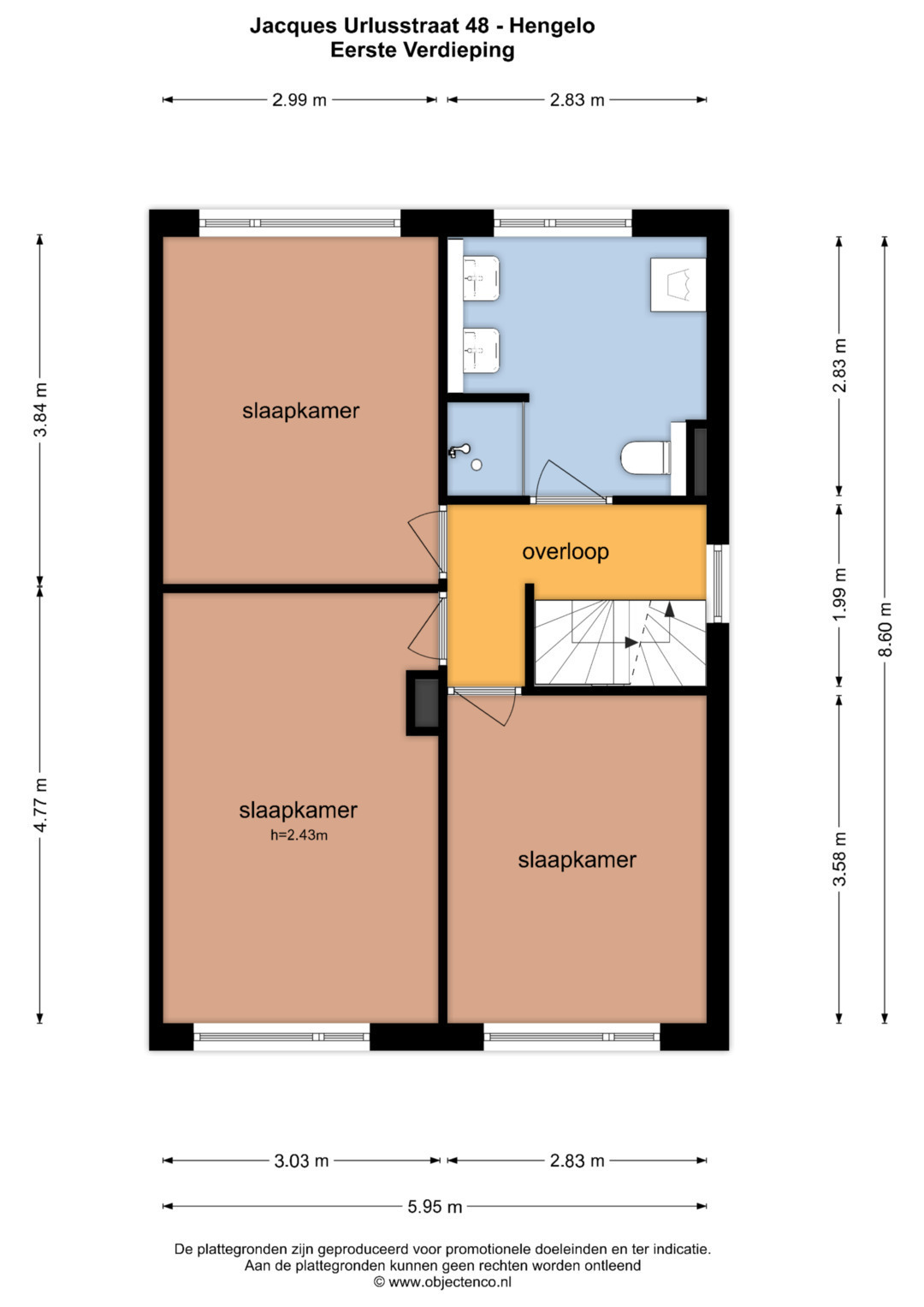 Overloop met een drietal slaapkamers, de badkamer en een vaste trap naar de tweede verdieping. De slaapkamers meten afgerond circa 14,5, 11,5 en 10 m².