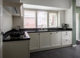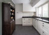 De keuken is voorzien van een inbouwkeuken met voldoende werk- en kastruimte. Het geheel is afgewerkt met een natuurstenen aanrechtblad waarin verwerkt een enkele RVS-spoelbak. Als bewoner heeft u de beschikking over de navolgende inbouwapparatuur: afzuigkap, koelkast, 5-pits gaskookplaat, magnetron en een vaatwasser.