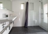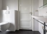 De geheel betegelde badkamer meet een oppervlakte van circa 5 m² en is uitgevoerd met een douche, toilet en een dubbele wastafel. Ventilatie geschiedt op zowel mechanische als natuurlijke wijze. De badkamer geeft daarnaast toegang tot het ruime dakterras middels een openslaande deur.