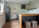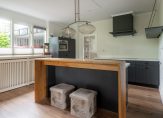 Vanuit de woonkamer is er toegang tot de half open keuken van afgerond 10 m². Als bewoner heeft u de beschikking over een moderne inbouwkeuken in fraaie opstelling met granieten werkblad waarin verwerkt een enkele RVS spoelbak. Als inbouwapparatuur een 5-pits inductiekookplaat, afzuiginstallatie, koelkast, vriezer, vaatwasser, Quooker en een combi-/magnetronoven.