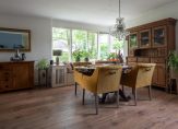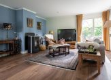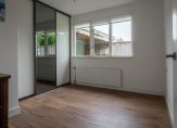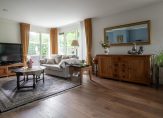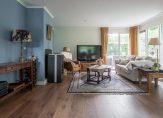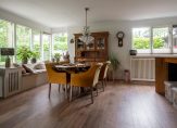 De woonkamer is heerlijk ruim en licht, mede door de grote ramen aan de voor- en zijkant en heeft een oppervlakte van maar liefst 44 m². De vloer is afgewerkt met pvc, het geheel is opgedeeld in een zit- en eetgedeelte en toegang tot het zijterras is er via een openslaande deur.