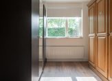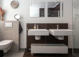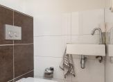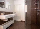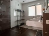 De courante en nette badkamer is royaal bemeten (circa 8 m²) en voorzien van een ruime inloopdouche, dubbele wastafel, radiator en een hangend toilet. Ventilatie geschiedt op natuurlijke wijze.