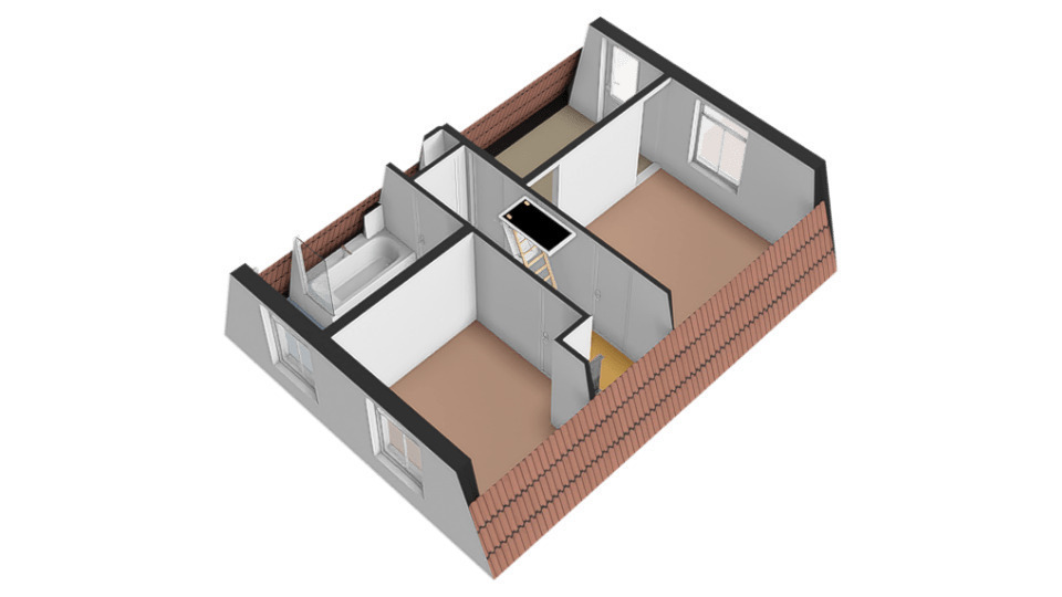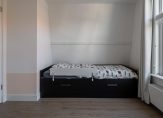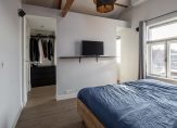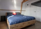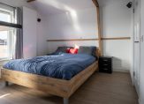 Stookruimte en een tweetal slaapkamers, waarbij de ouderslaapkamer aan de achterzijde de beschikking heeft over een inloopkast (voorheen was dit de derde slaapkamer). De slaapkamers meten afgerond 12 en 9 m², zijn beide afgewerkt met een pvc vloer en hebben houten kozijnen met isolerend glas. Erg bijzonder is het feit dat de nok van het dak met authentieke balken een zichtfunctie heeft gekregen.