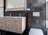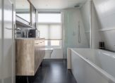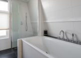 De vernieuwde en moderne, in lichte kleurstelling betegelde badkamer meet een oppervlakte van 7 m² en is voorzien van vloerverwarming. Daarnaast als sanitair een ligbad, inloopdouche, toilet, designradiator en een dubbele wastafel met ombouw.