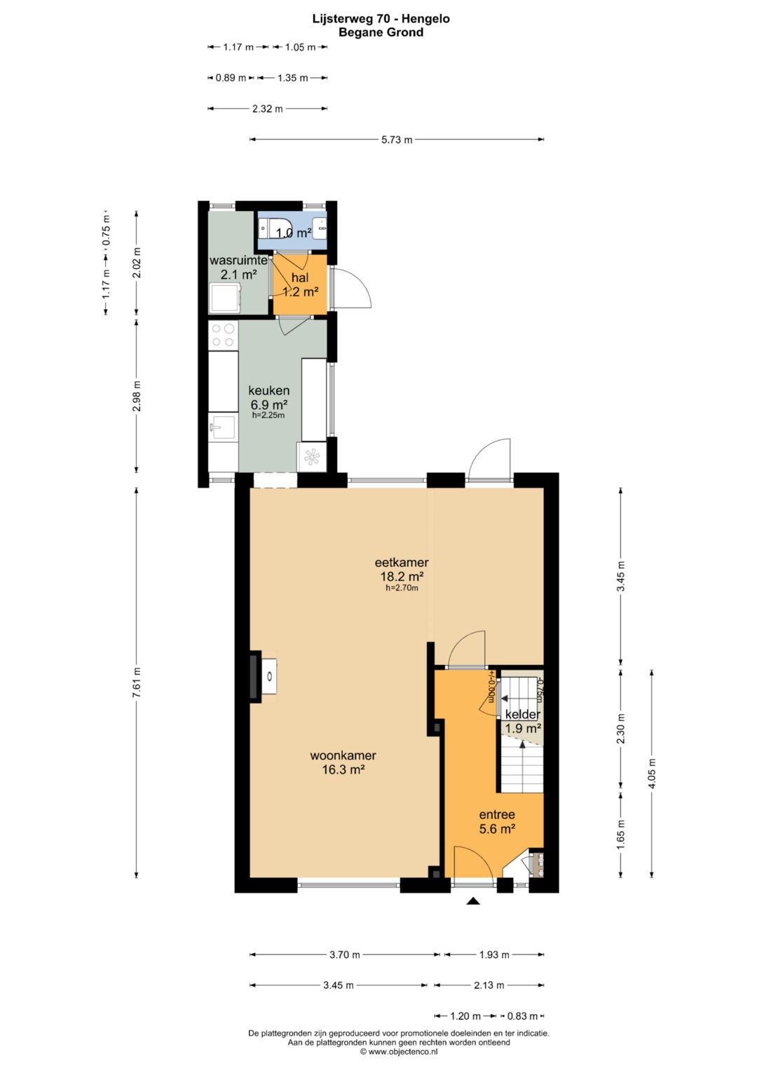 Entree, hal met garderobe, meterkast en vaste trapopgang naar de eerste verdieping (met onder de trap een kelderkast), L-vormige living, keuken, achter portaal met toilet en wasruimte.