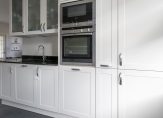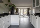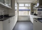Aan de voorzijde van de woning bevindt zich de keuken. Hier is een luxe inbouwkeuken geplaatst in zwart/wit kleurstelling. De keuken heeft de beschikking over een granieten werkblad met een enkele spoelbak. Als apparatuur is het volgende geplaatst: vaatwasser, elektrische grill/heteluchtoven, magnetron, 3 laden diepvries, koelkast en een 5-pits inductiekookplaat met rvs afzuigkap. U heeft tevens de mogelijkheid om gezellig na te tafelen in de keuken.