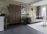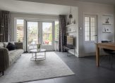 De riante woonkamer meet een oppervlakte van maar liefst 30 m² en is voorzien van een airco, waardoor het ook tijdens de warme dagen lekker koel is binnen. De woonkamer is aan de achterzijde uitgebouwd en voorzien van openslaande tuindeuren. Vanuit de kamer is er tevens toegang tot de kelder en het achter portaal met toilet.