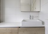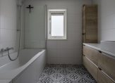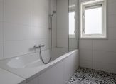 De badkamer bevindt zich aan de achterzijde van het woonhuis en meet een oppervlakte van circa 5 m². De badkamer beschikt over een ligbad (waarin tevens kan worden gedoucht middels een spatscherm), designradiator en een wastafelmeubel met waskom. Natuurlijke ventilatie door middel van een openslaand raam en tevens is de badkamer voorzien van mechanische ventilatie.