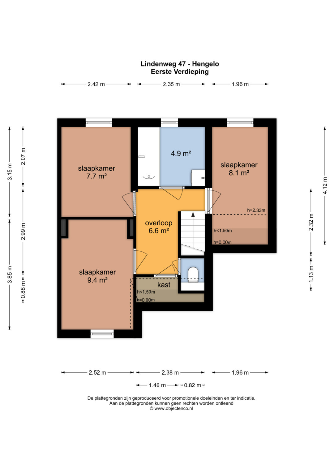 Overloop met vaste kastruimte en een toilet, de badkamer en een drietal slaapkamers, waarvan de grote slaapkamer aan de achterzijde voorzien is van screens. De slaapkamers meten afgerond 9,5, 8 en 7,5 m².