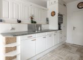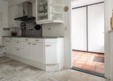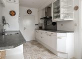 Vanuit de woonkamer is er toegang tot de half open keuken. Als bewoner heeft u de beschikking over een inbouwkeuken in lichte kleurstelling met kunststof werkblad waarin verwerkt een enkele spoelbak. Als inbouwapparatuur een 4-pits inductiekookplaat, combi-ovenmagnetron, koelkast en een afzuigkap. Vanuit de keuken heeft u toegang tot de hal welke toegang geeft tot twee achterliggende slaapkamers.