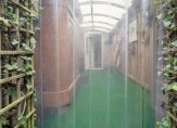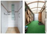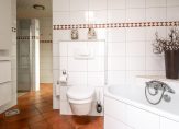 De courante en volledig betegelde badkamer is voorzien van een ruime inloopdouche, ligbad, dubbele wastafel, hangend toilet en designradiator. Ventilatie geschiedt op mechanische wijze. Vanuit de badkamer is er middels de overdekte gang met buitendouche toegang tot de sauna en tuin.