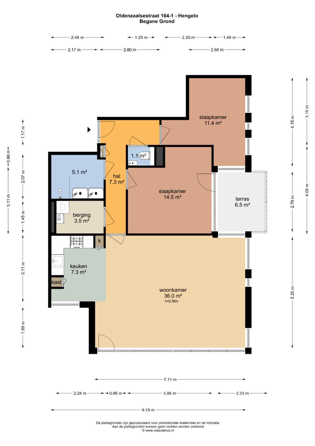 De twee slaapkamers zijn comfortabel bemeten met respectievelijk circa 14,5 en 11,5 m², waarbij de grootste slaapkamer directe toegang biedt tot het aangrenzende terras.