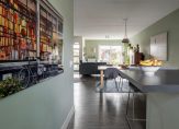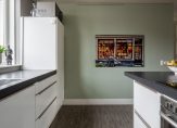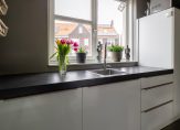 Vanuit de hal komt u in de open keuken. Hier zien we een uiterst courante inbouwkeuken in lichte kleurstelling met de navolgende inbouwapparatuur: 4-pits inductie kookplaat, RVS afzuigkap, koel-vriescombinatie, vaatwasser en een oven. De keuken is verder uitgevoerd met een kunststof aanrechtblad waarin verwerkt een enkele RVS spoelbak.