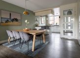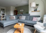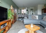 De tuin gerichte woonkamer meet een oppervlakte van 34 m² en is heerlijk licht door het vele glas in de achtergevel. De vloer is voorzien van PVC. De schuifpui in de achtergevel zorgt ervoor dat u zowel in het voor- als najaar optimaal kunt genieten van de achtergelegen tuin.