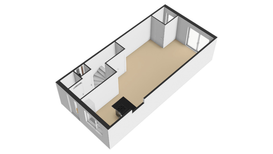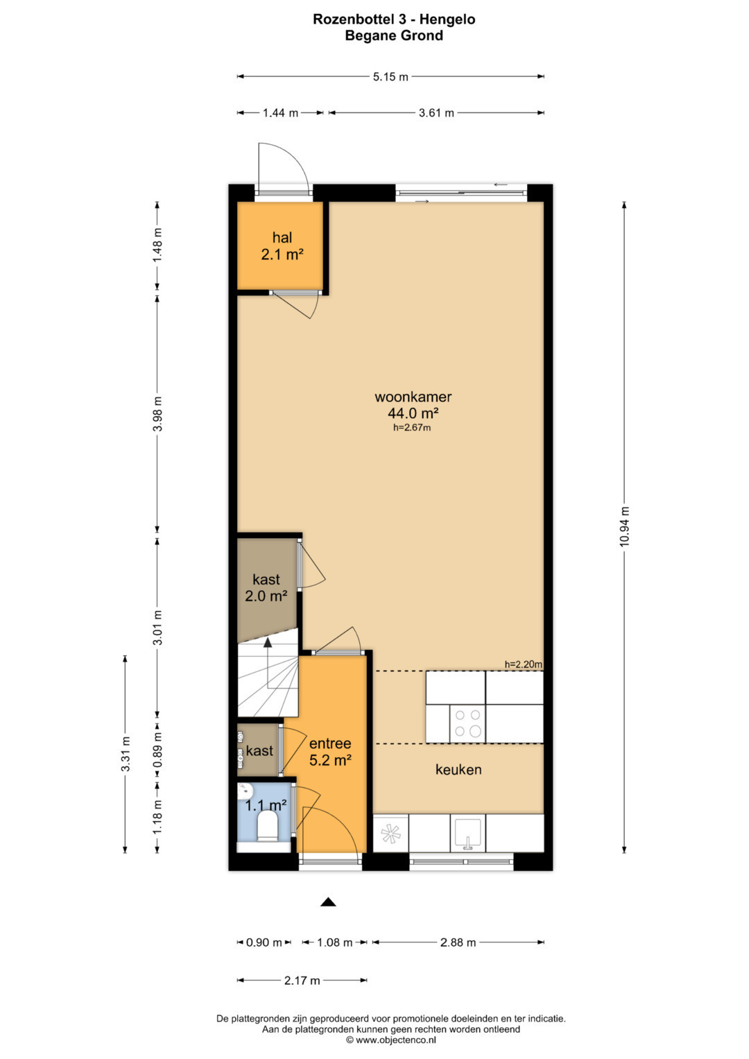 Entree/hal met meterkast, toilet met fontein, trapopgang naar de eerste verdieping met daaronder een bergkast, woonkeuken en de woonkamer.