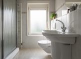 De geheel betegelde badkamer van circa 5 m² is gelegen aan de voorzijde van de woning en voorzien van een douche, wastafel en een toilet. Ventilatie geschiedt op natuurlijke wijze en voor de verwarming is een design radiator aanwezig.