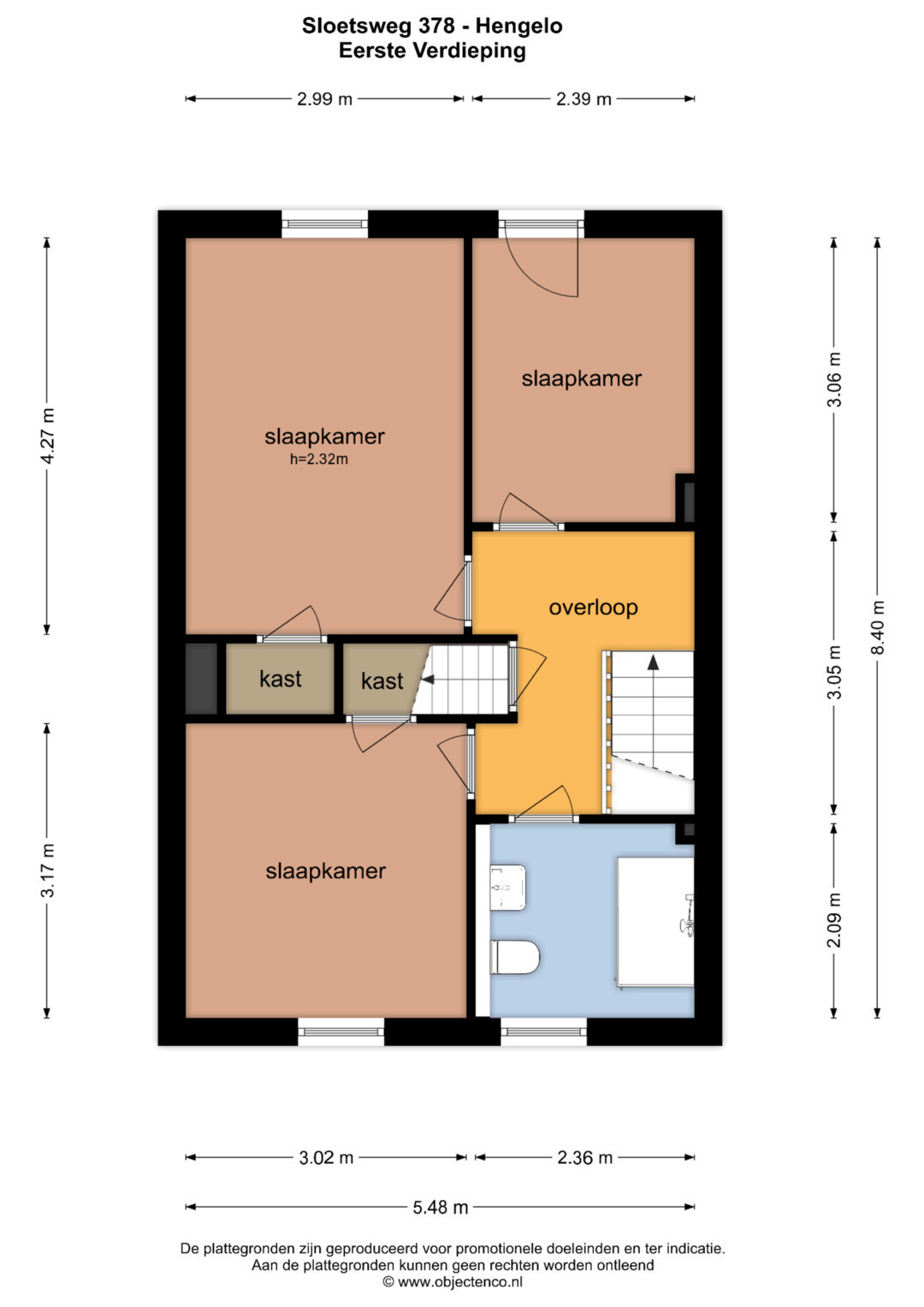 Overloop, drietal slaapkamers en de badkamer. De slaapkamers meten respectievelijk 13, 10 en 7 m², waarvan er twee beschikken over een vaste kastruimte.