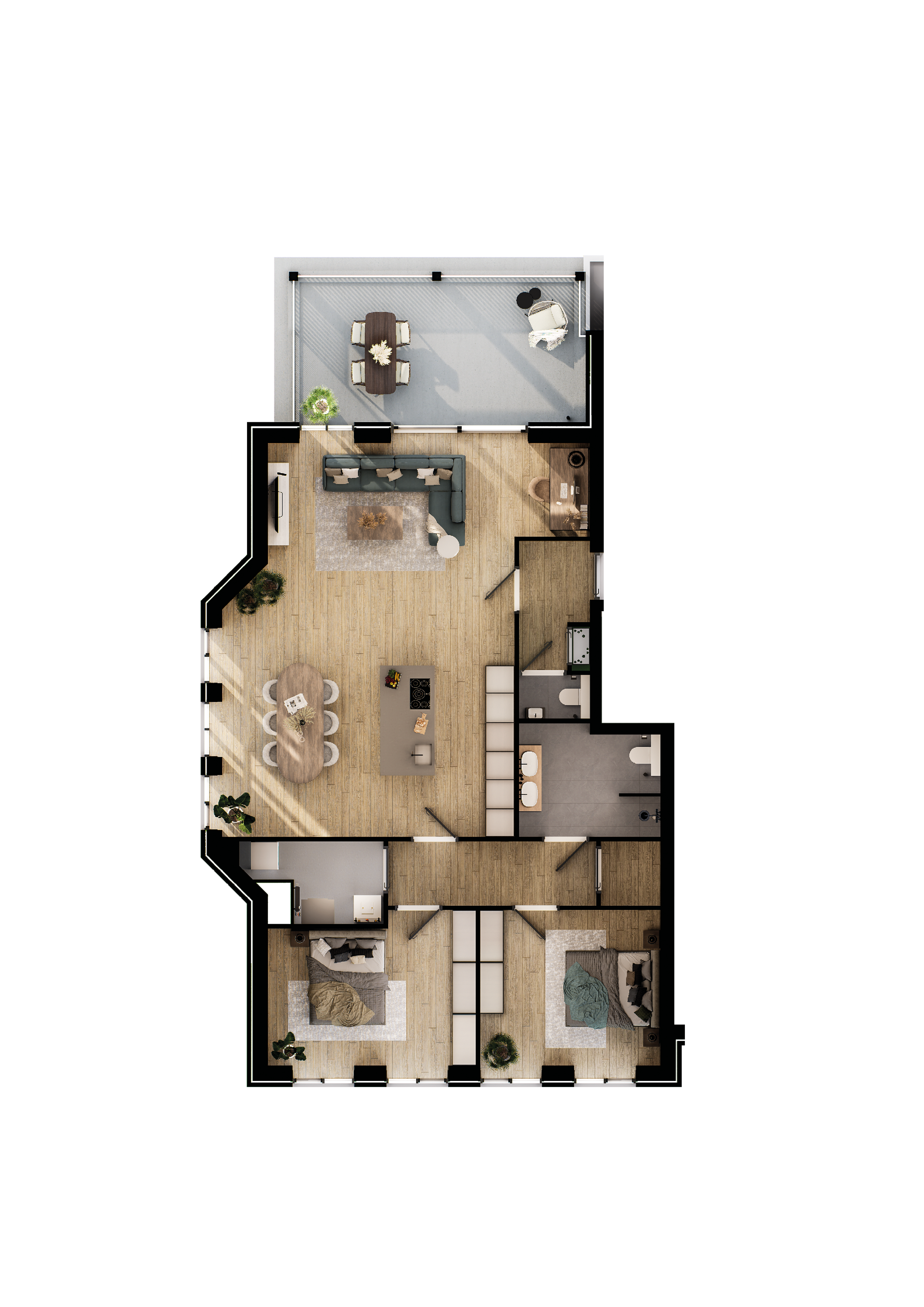 * Het appartement wordt opgeleverd zonder keuken, maar met standaard aansluitpunten.