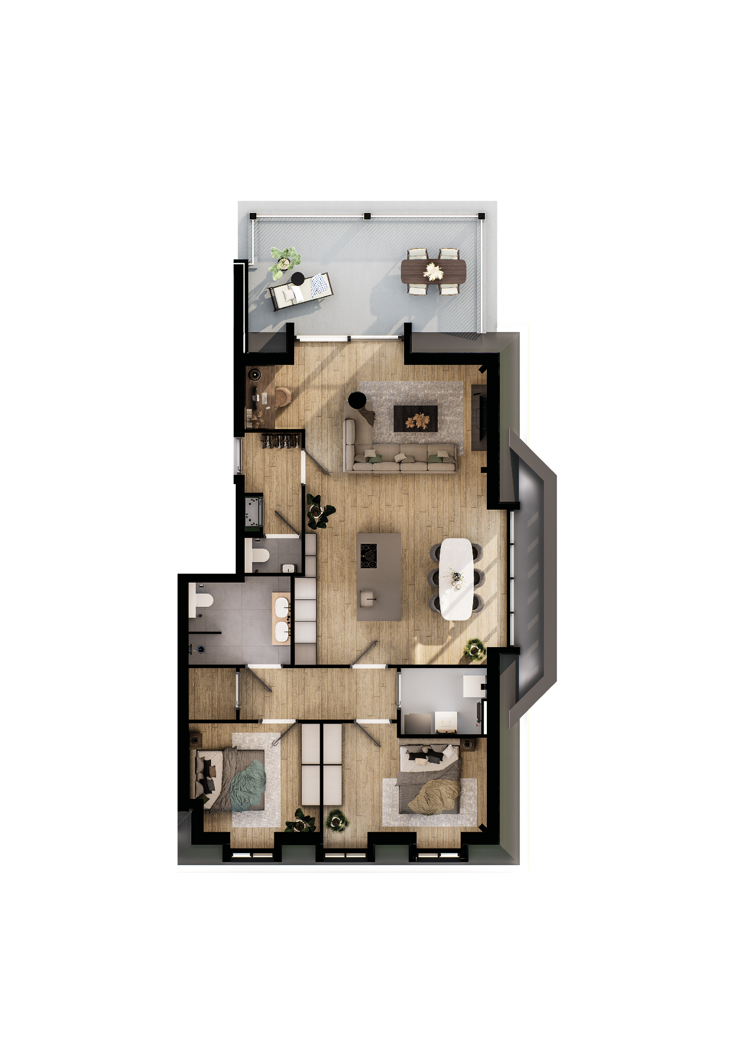 De moderne badkamer is naar je eigen smaak ingericht, de ruimte, je royale douche en de dubbele wastafel geven je het gevoel van een hotel chique allure. Je eerste koffie van de dag maak je in je eigen keuken met kookeiland waar je gisteren nog met vrienden gezellig gekookt hebt. De zon lokt je naar je balkon op het zuiden waar je door het privacy scherm heerlijk van de eerste zonnestralen op je mooie beschutte terras kunt genieten. Je kijkt uit over de stad en het groen van de Drienerbeek, heerlijk rustig en toch middenin de stad.
