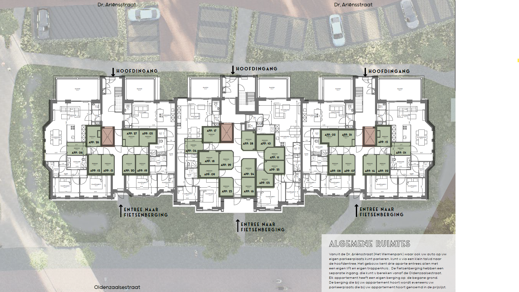 * Het appartementencomplex kent drie aparte hoofdentrees (vanuit de Dr. Ariënsstraat) allen voorzien van een gesloten entree met intercominstallatie, postbussen, een lift en trappenhuis.