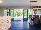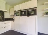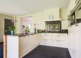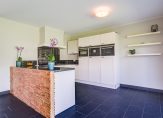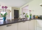 Grenzend aan de living bevindt zich de royale leefkeuken van 34 m², compleet uitgerust met een moderne inbouwkeuken die aan al uw wensen voldoet. Het composieten aanrechtblad met uitstortgootsteen is zowel stijlvol als praktisch. De keuken beschikt over een vaatwasser, koelkast, vriezer, 5-pits gaskookplaat, RVS afzuigschouw, combimagnetron/oven en een stoomoven. Openslaande tuindeuren in de achtergevel bieden directe toegang tot de achtertuin, waardoor binnen en buiten naadloos in elkaar overlopen. Kortom, een perfecte leefruimte voor koken, eten en ontspannen.