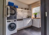 De bijkeuken beschikt over een roestvrijstalen werkblad met uitstortgootsteen en is voorzien van aansluitingen voor zowel wasmachine als droger.