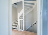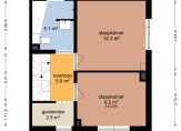 Op de eerste verdieping bevinden zich twee comfortabele slaapkamers van 12 en 9 m². Beide kamers zijn voorzien van een moderne laminaatvloer, waarbij één slaapkamer bovendien beschikt over praktische vaste kastruimte. Aan de voorzijde bevindt zich daarnaast nog een extra kamer van ca. 2,5 m², die thans in gebruik is als garderobekast. Met een knusse afmeting biedt deze kamer volop mogelijkheden, van een gezellige kinderkamer tot een compacte thuiswerkplek.